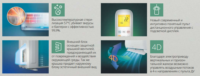 Дизайн отвечает актуальным трендам: внутренний блок выполнен из высококачественного пластика и предлагается в трёх цветовых решениях. Лаконичная форма и компактные габариты упрощают монтаж и позволяют органично вписать устройство в любой интерьер. Все материалы безопасны и соответствуют современным стандартам качества.Сплит‑система обеспечивает комфортный микроклимат за счёт широкого функционала.