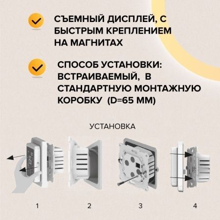 Благодаря оригинальному решению по соединению двух частей терморегулятора его можно использовать совместно с рамками электроустановочных изделий многих известных брендов (Schneider Electric, Legrand, Werkel, ABB, Lexman, Viko, Hegel, Gira, Hager, Jung, Berger, Merten, IEK и других). Более подробный перечень указан ниже *.