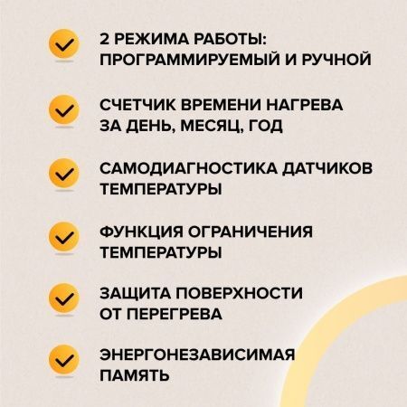 Новая уникальная функция защиты от перегрева обеспечивает контроль температуры поверхности для бережного ухода за напольными покрытиями. Подключение дополнительного датчика температуры поверхности (помимо основного рабочего) позволяет избежать перегрева и обеспечить дополнительную защиту. Активация режима требует приобретения дополнительного датчика температуры SU 7х20 или SF 5х25 (сопротивление 10 кОм) и установки его в месте, где в последствии возможна установка мебели или других предметов интерьера и вероятен перегрев (пример реализации Вы можете увидеть в карточках товара в разделе «фото»).